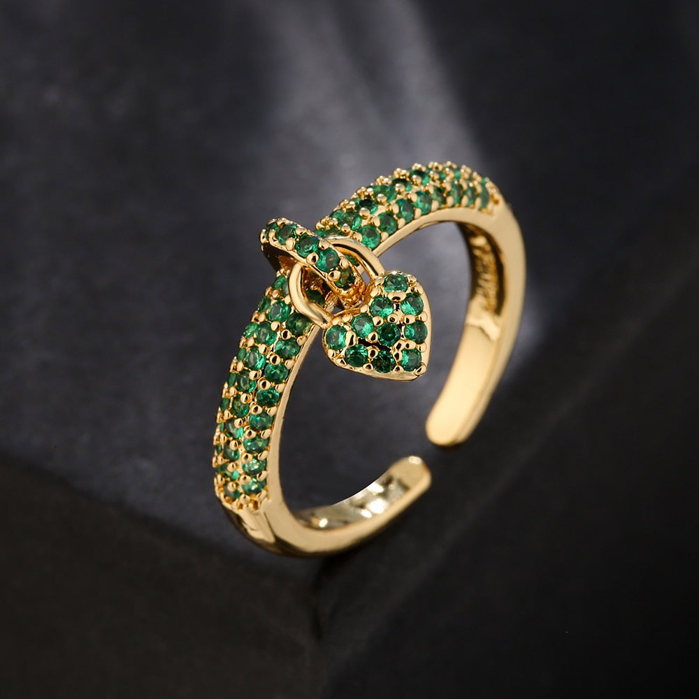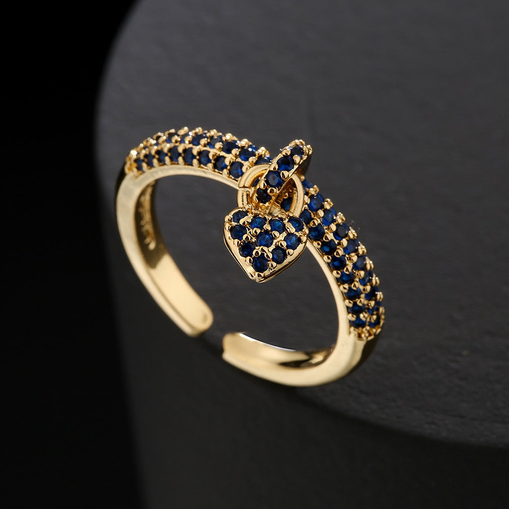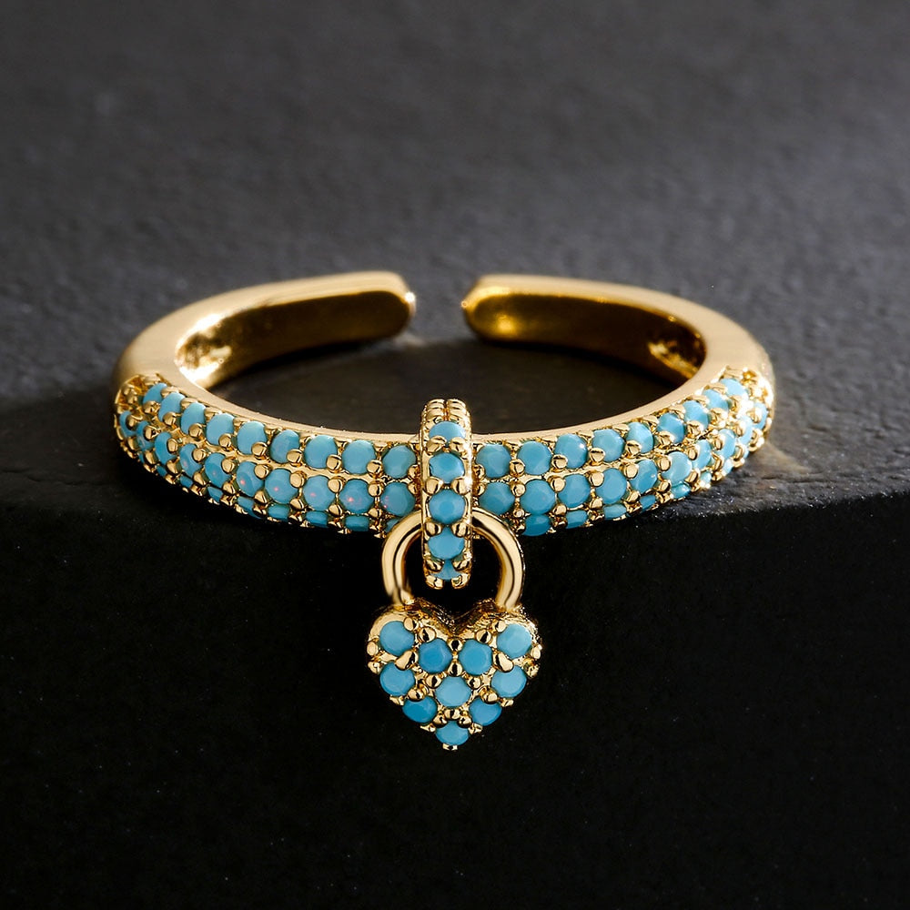 Osez la couleur en arborant cette bague captivante avec son pendentif coeur à l'effigie de l'amour. Finie à la main, cette très jolie bague aux détails soignés est confectionnée en cuivre. Elle est ornée de plusieurs rangées d'oxydes de zirconium finement incrustés sur l'anneau. Un demi-cercle serti par des zircons cubiques accueille le pendentif en forme de coeur. Ce dernier est paré de petits zircons, créant ainsi un bijou qui brille sous tous les angles. Portez cette magnifique bague seule ou superposez-la à d'autres bagues pour donner à votre allure la dose d'audace souhaitée.