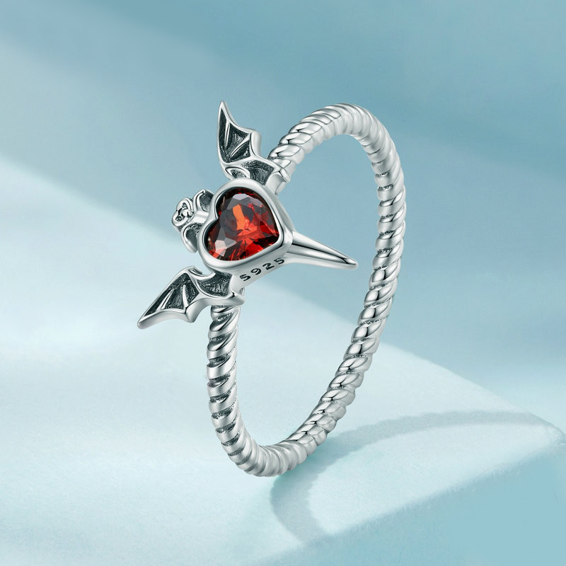 Une bague au design détonnant qui ajoutera du piquant à votre look. Cette bague coeur d'inspiration gothique se mariera aussi bien avec votre look de tous les jours que lors d'occasions plus spéciales. Confectionnée main, cette bague coeur en argent 925/1000ᵉ se présente sous la forme d'ailes de chauve-souris dont la finesse des détails travaillés à l'argent oxydé ne laissera personne indifférent. Au milieu des ailes trône le pavé, orné d'un oxyde de zirconium de couleur rouge en forme de coeur. Une épée transperçant de part en part le coeur vient parachever le design de la bague. Un bijou coeur unique pour une personnalité unique.
