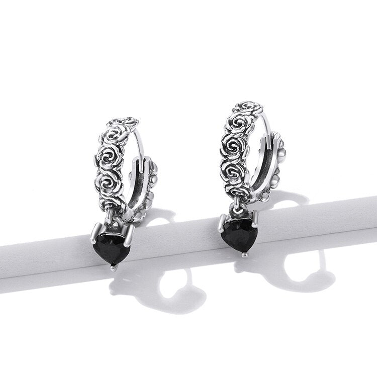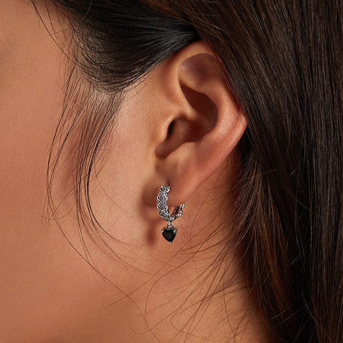 Agrémentez votre style d'une touche de mystère avec ces superbes boucles d'oreilles de type "Créoles". Vous aimez la beauté frappante et immédiate d'une rose éclose au matin et êtes séduite par le doux mystère enveloppant de la nuit ? Ces boucles d'oreilles coeur réunissent ces deux inclinaisons de manière élégante et audacieuse. Finies main en argent 925/1000ᵉ, elles sont ornées d'une série de roses en argent oxydé et d'un oxyde de zirconium noir en forme de coeur pour le pendant.