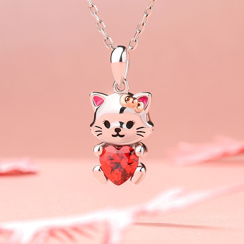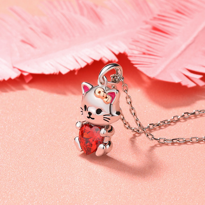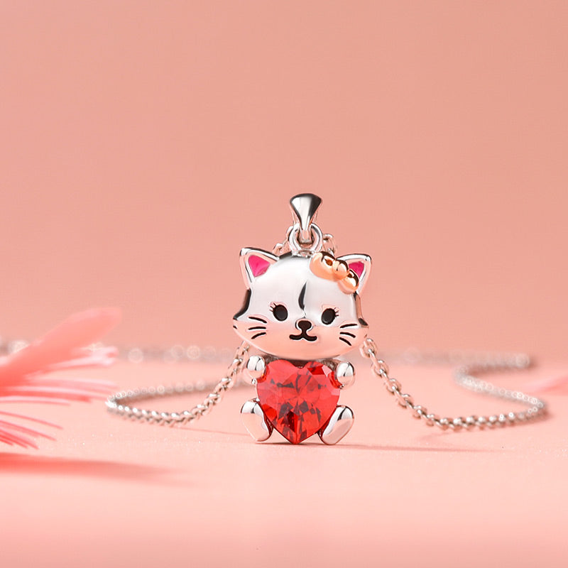 Ce collier de création artisanale se compose d'un adorable chaton argenté en pendentif. Les détails de sa frimousse tels que les yeux, le museau, les moustaches et la bouche sont dessinés avec une résine façon émail de couleur noire, tandis que ses oreilles sont réhaussées avec une résine façon émail de couleur rose. Le chaton tient entre ses pattes un zircon cubique rouge en forme de coeur. Un élégant bijou pour montrer combien votre charmante boule de poils occupe une place spéciale dans votre cœur.