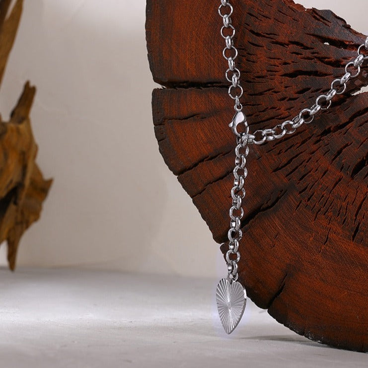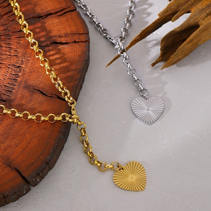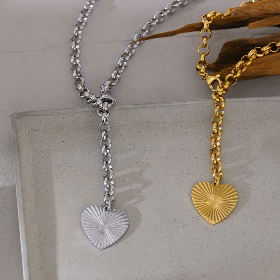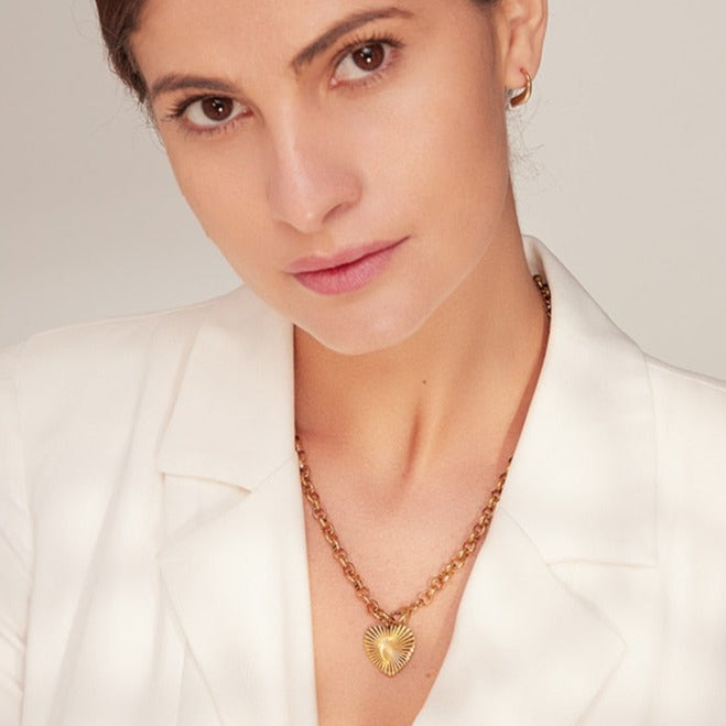 Arborez ce bijou romantique et rayonnez de bonheur ! Fini à la main, ce collier est orné d'un pendentif plat en forme de coeur. Un cercle est gravé au centre duquel partent des rayons finement ciselés. Aussi surprenant que cela puisse paraître, ce coeur peut aussi bien jouer le rôle d'un soleil que celui d'un coquillage. Un bijou élégant aux deux visages, à porter seul pour égayer votre look de tous les jours, ou combiné avec d'autres bijoux coeur de notre collection pour un maximum de glamour.