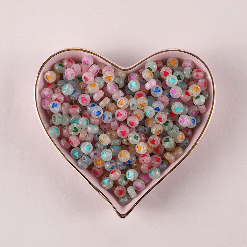 Craquez pour cet assortiment de 100 perles rondes transparentes ornées d'un coeur coloré, accessoire indispensable pour la réalisation de vos bijoux romantiques Vous pouvez les combiner avec d'autres perles coeur de notre collection afin de confectionner des bijoux encore plus glamour. Associer vos créations avec nos bijoux coeur pour un look multidimensionnel.