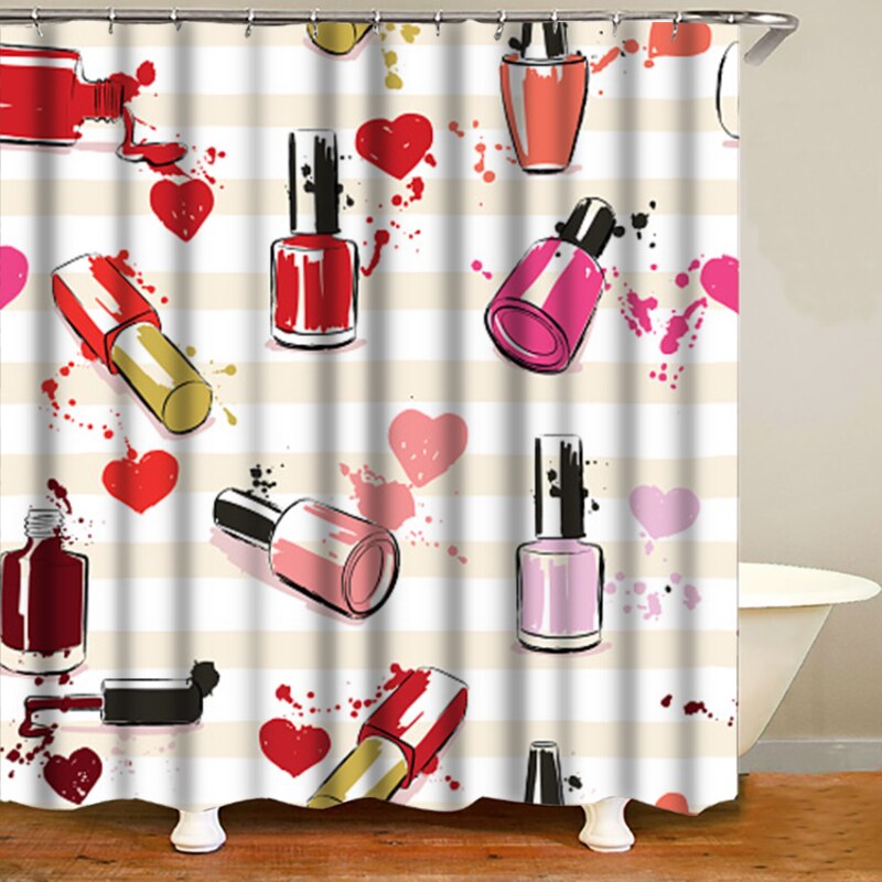 Découvrez notre rideau de douche avec un imprimé coeur et vernis à ongles. Il amènera une note girly et chaleureuse à votre salle de bain. Dites au-revoir aux éclaboussures incessantes ! Avec nos rideaux de douche imprimé coeur, vous maintenez votre salle de bains au sec tout en créant une ambiance chaleureuse de bien-être. Nos rideaux s'adaptent à toutes les barres de douche.
