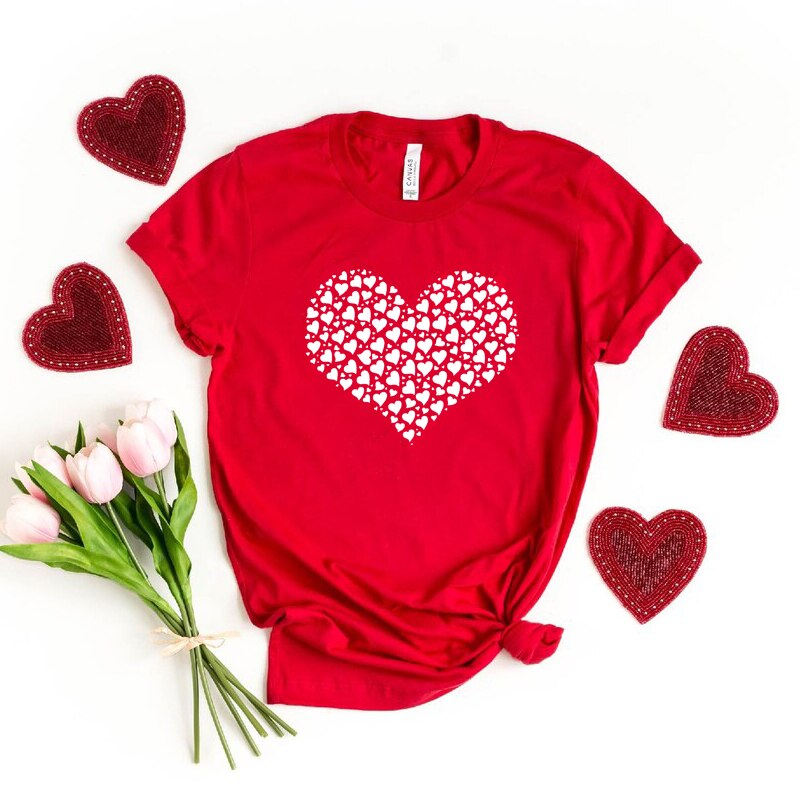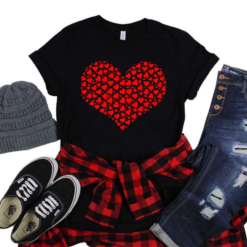 Actualisez votre garde robe avec ce t-shirt manches courtes pour femme en coton. Sa coupe classique, son col ras du cou et son coeur plein de coeurs floqué au recto sublimera un large éventail de tenues. Elégant sous une veste, stylé avec un jean et décontracté avec une tenue d’été, il complètera à merveille votre look.